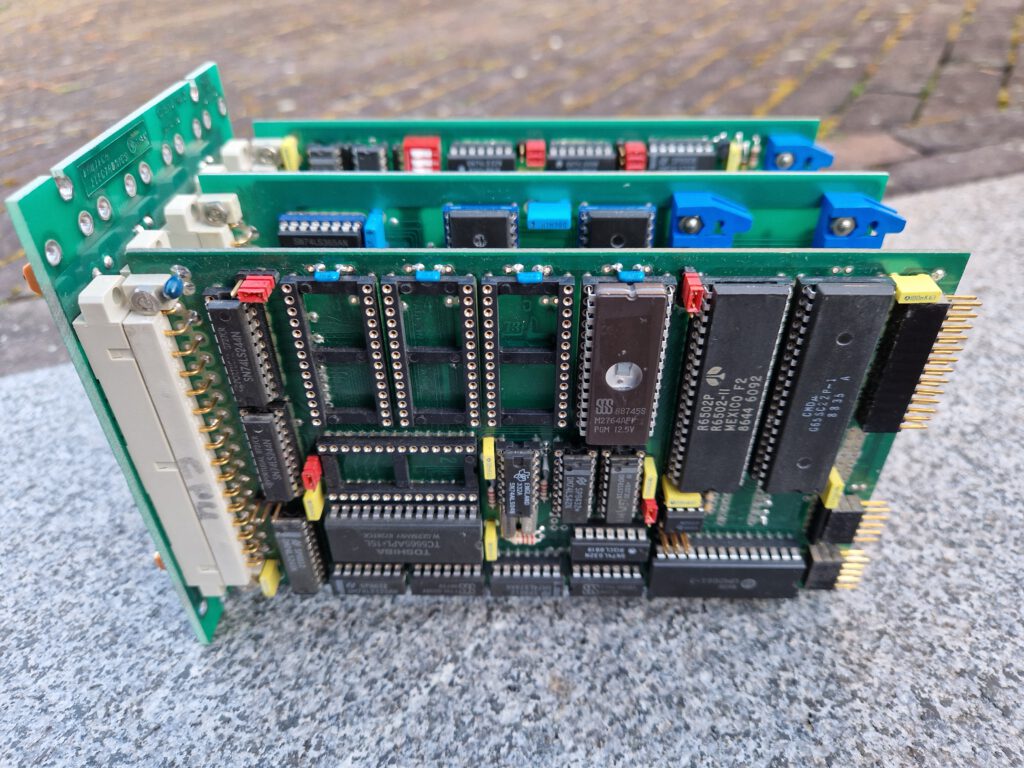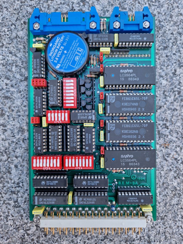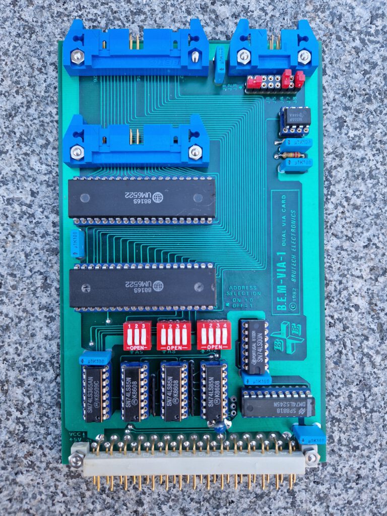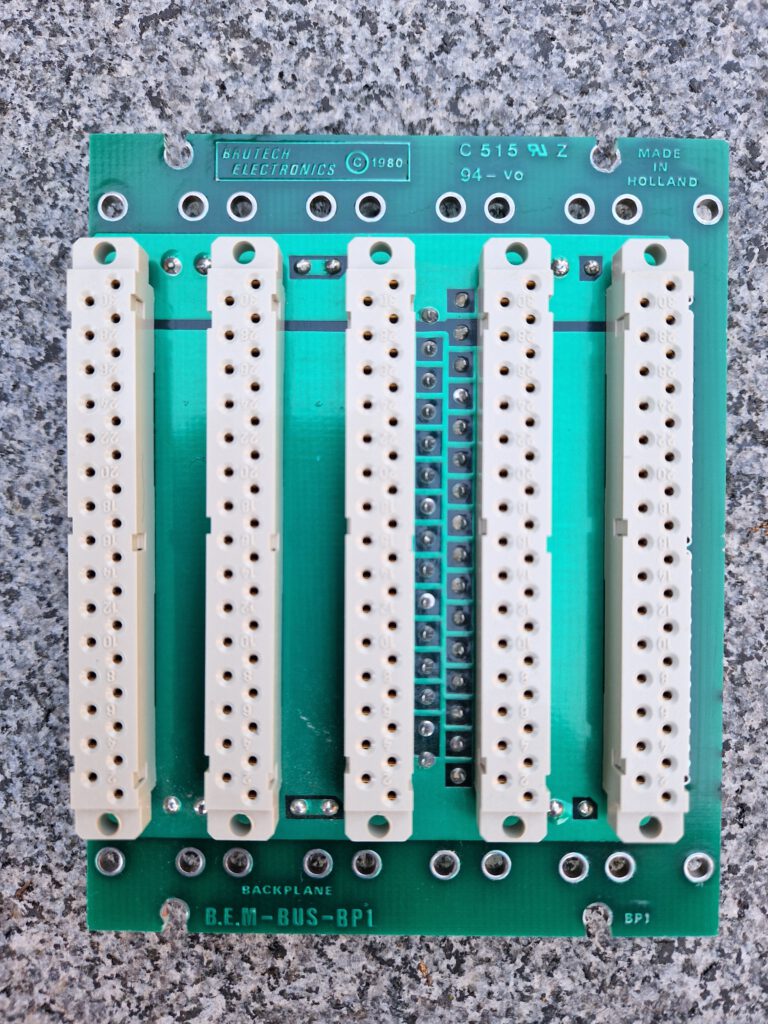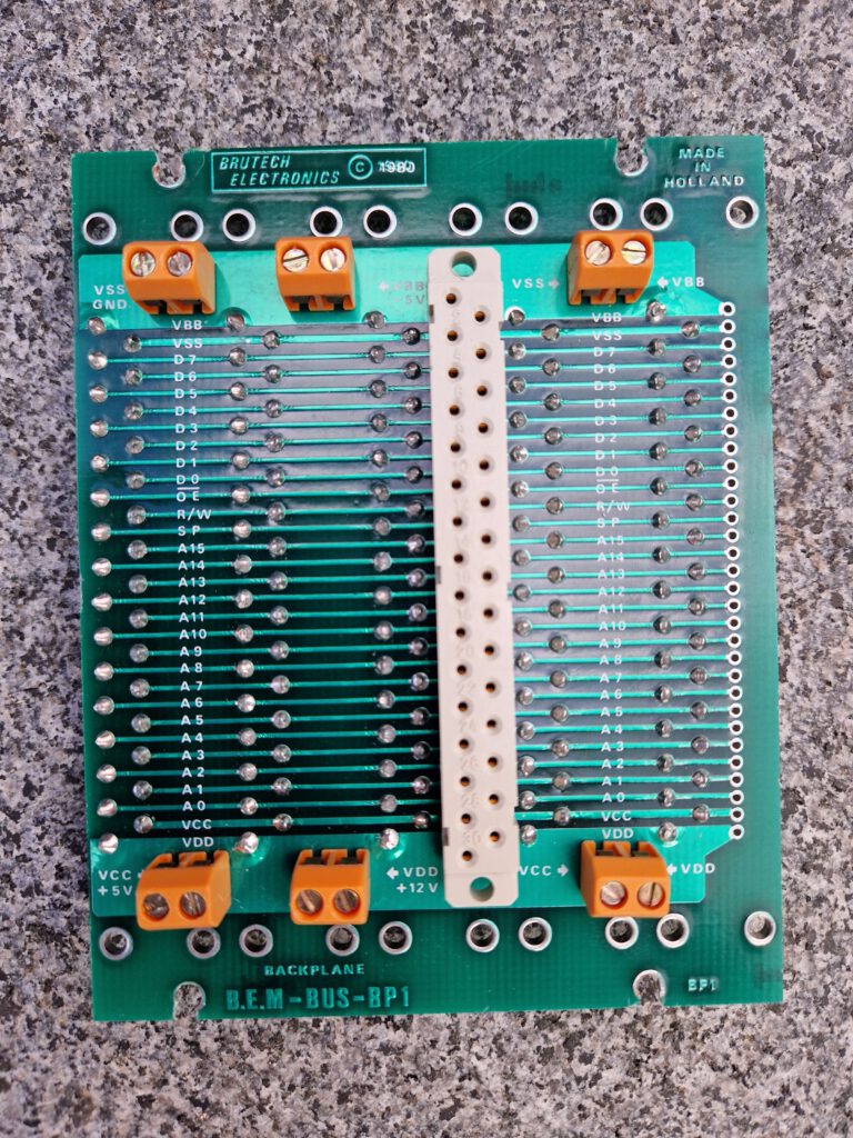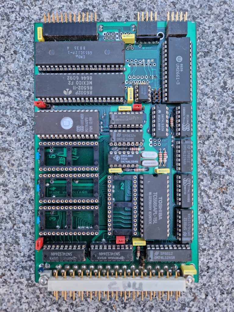 Gerben Voort acquired a 6502 system and made photos of the system. A backplane, the BEM bus, a 6502 based CPU card, a double VIA card, a battery backed up memory card.