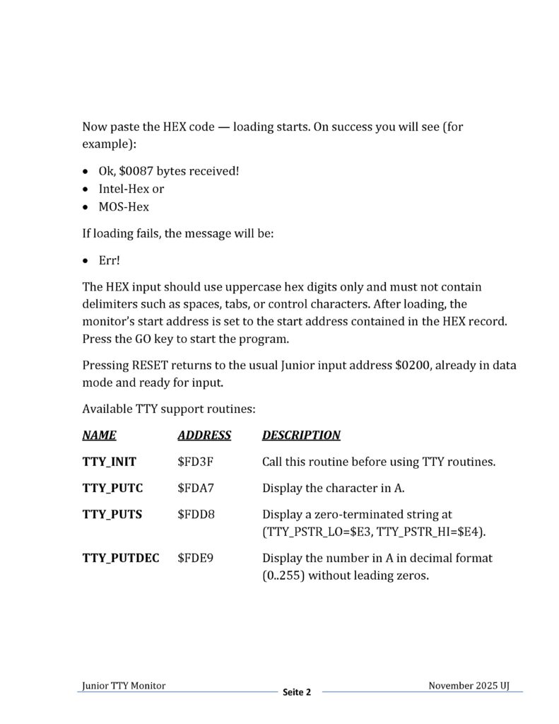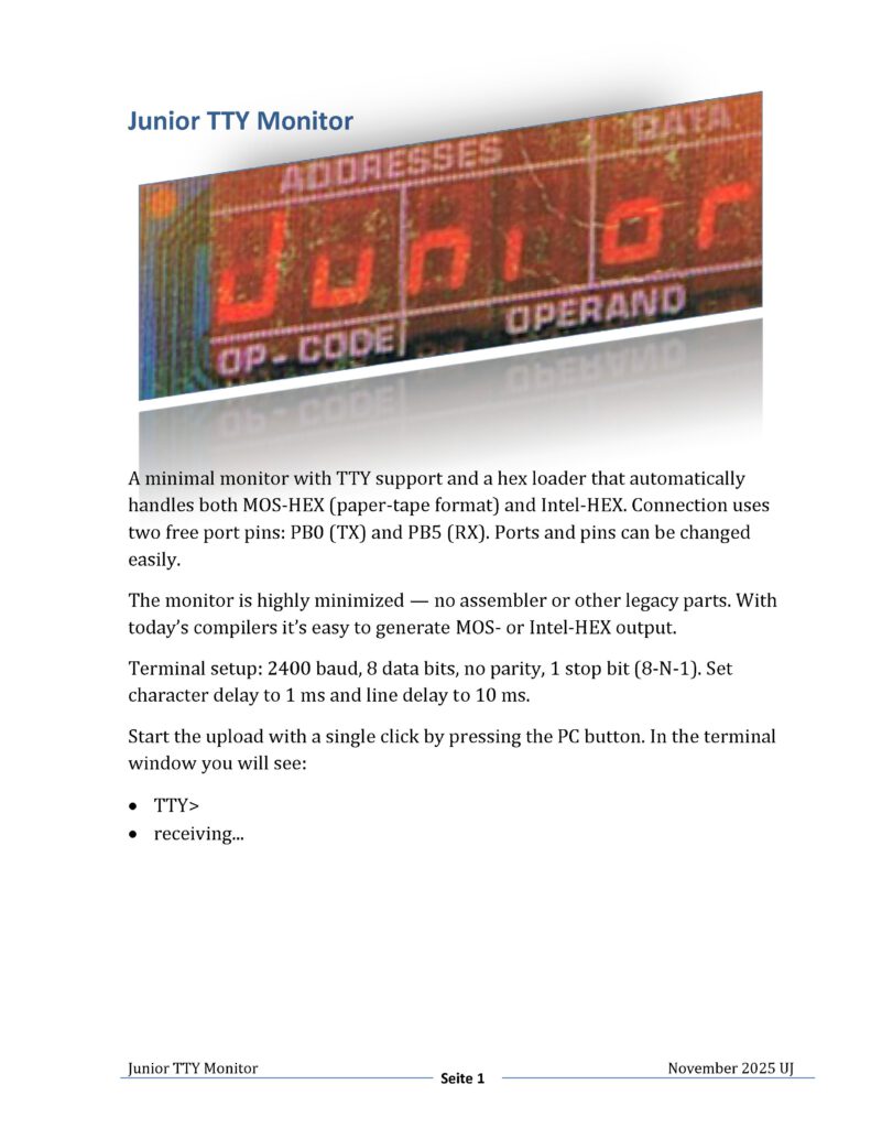 And added Intel Hex and MOS Technology papertape upload.. Furthermore some routines can be use in own programs like: TTY_INIT, TTY_PUTC, TTY_PUTS.