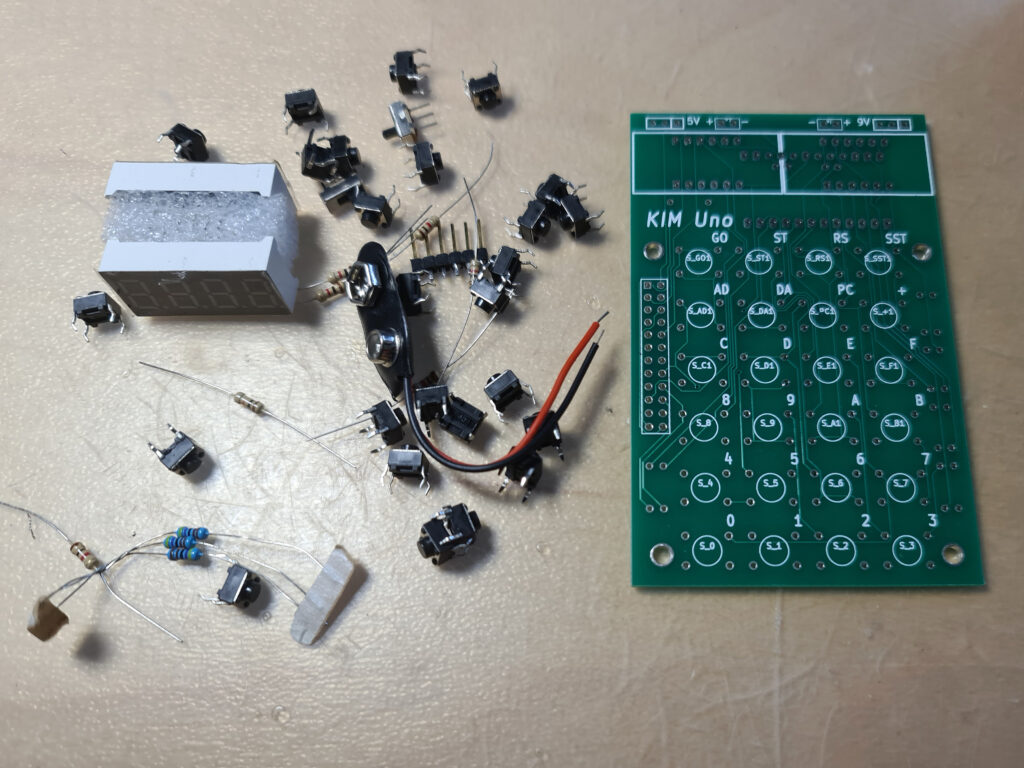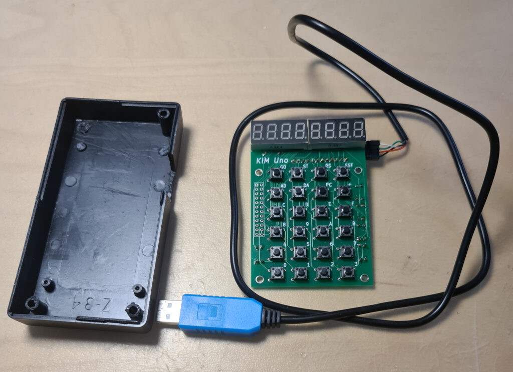 The software for the serial interface (you really need a good serial terminal emulator, like Minicom or Tera Term) can be used on any Arduino Uno. After power on it delivers a simulation of the LED display and the real KIM TTY teletype interface.