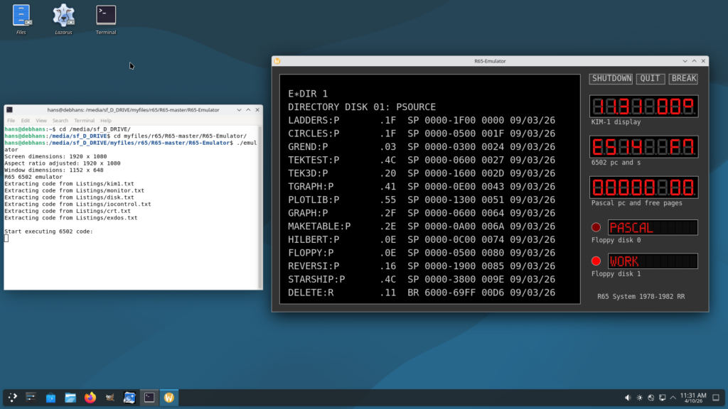 The original R65 computer included a BASIC interpreter, and an improved Tiny Pascal compiler. The R65 Pascal system, which was quite powerful for a 8-bit microprocessor at that time, and the BASIC interpreter have been reconstructed.