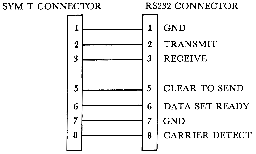 Our Spinwriter has a serial interface. This means we can use the serial interface software provided in the SYM-1 Monitor to send characters to the Spinwriter. The Spinwriter Product Description manual reveals that CARRIER DETECT (pin 8 on the RS232 connector), DATA SET READY (pin 6), and CLEAR TO SEND (pin 5) must be high (between +3 and +12 volts) for the Spinwriter to operate. This was simple to take care of since the SYM-1 provides this voltage at the corresponding locations of the T connector.