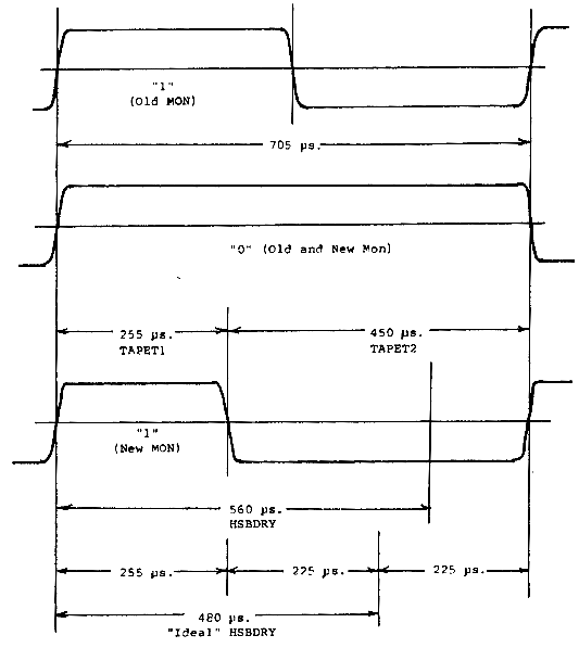 In the SYM format, the bit period is constant. A “one” is two transitions per bit period, and a “zero” is one transition per bit period. In the original monitor, the two intervals for the one were symmetical. In the new monitor, however, the first interval, (the only one measured) is narrower than the second, making it easier to distinguish between a short period (one) and a long period (zero). The intervals are specified by variables TAPET1 and TAPET2 which are initilized by reset to $33 and $5A respectively. These numbers represent a number of 5-microsecond intervals. Thus each bit time is $8D (141 dec.) intervals or 705 microseconds. The transition time interval is measured by starting the 6532 timer at $FF, counting down with the divide by eight clock. When a transition is detected, the value originally in location $A632 = HSBDRY (High Speed BounDRY) is added to the value from the timer. If the interval was short, the counter will not have counted down very far from $FF and adding HSBDRY will result in a carry which is interpreted as a “one-bit” transition. Thus the ability to distinguish between a one and a zero depends upon how carefully we choose the high speed boundary value. The default value of $46 (70 decimal) gives a boundary time of 70 × 8, or 560 microseconds. Synertek arrived at this value experimentally by trying several popular recorders. There is no guarantee that this value is ideal for your recorder. To split the difference between the short and long transitions would give an “ideal” boundary of 255 + 225, or 480 microseconds, or 60 ($3C) 8-microsecond intervals. If your recorder is closer to the ideal response, the default value of 560 microseconds will cause slightly narrow zero intervals to be interpreted as ones giving a bad reading. Before I took a look at the numbers, I experimentally determined the value of HSBDRY for my Panasonic recorder to be about $3C. Actually there was quite a range from $40 down to $39, but HSBDRY definitely needed to be smaller. Interestingly, I still can load tapes only over a very narrow range of volume settings.