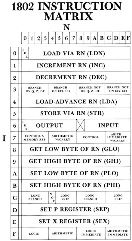 Do you remember the 1802's I and N registers? A large number of 1802 instructions can he readily understood by breaking them down into their I and N components. Generally speaking, the contents of I determine the operation to take place, while the contents of N designate the general purpose 16 bit register to be used or affected. Look at the illustration of the instruction matrix. Each unbroken horizontal area represents an instruction of this type. Even the LDN instruction in the first row is like this except that it is not applicable to R0, since the 00 hex op-code has been preempted for use as the IDL instruction.